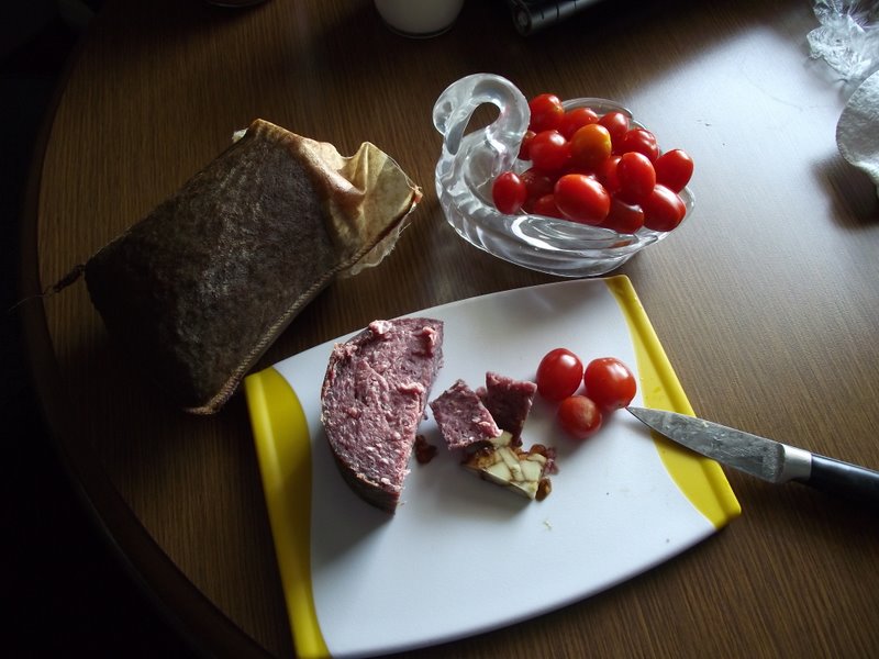 nonite Sausage, Carmelized Onion Marbled Cheese and fresh picked tomatoes. Gord adds bread.