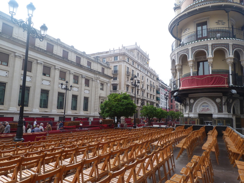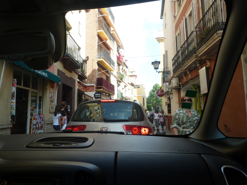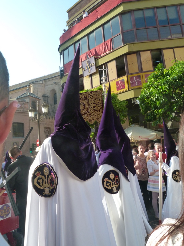 Holy Week is in full swing here in the holiest of Holy Week spots. We knew it but had not imagined the enormity of the celebration. The Fiat we rented got us into the centre of town, a 10 minute walk on a normal day from lot to hotel. 7 hours of dodging babies in strollers, grandmothers in wheel chairs, pull-in-your-side-mirrors ‘kissing lanes’, kind offers of driving directions, ‘IMPOSSIBLE!!’ hand gestures, and finally a police escort, we parked and walked with bags in hand, amidst crushing crowds to El Rey Moro Hotel.